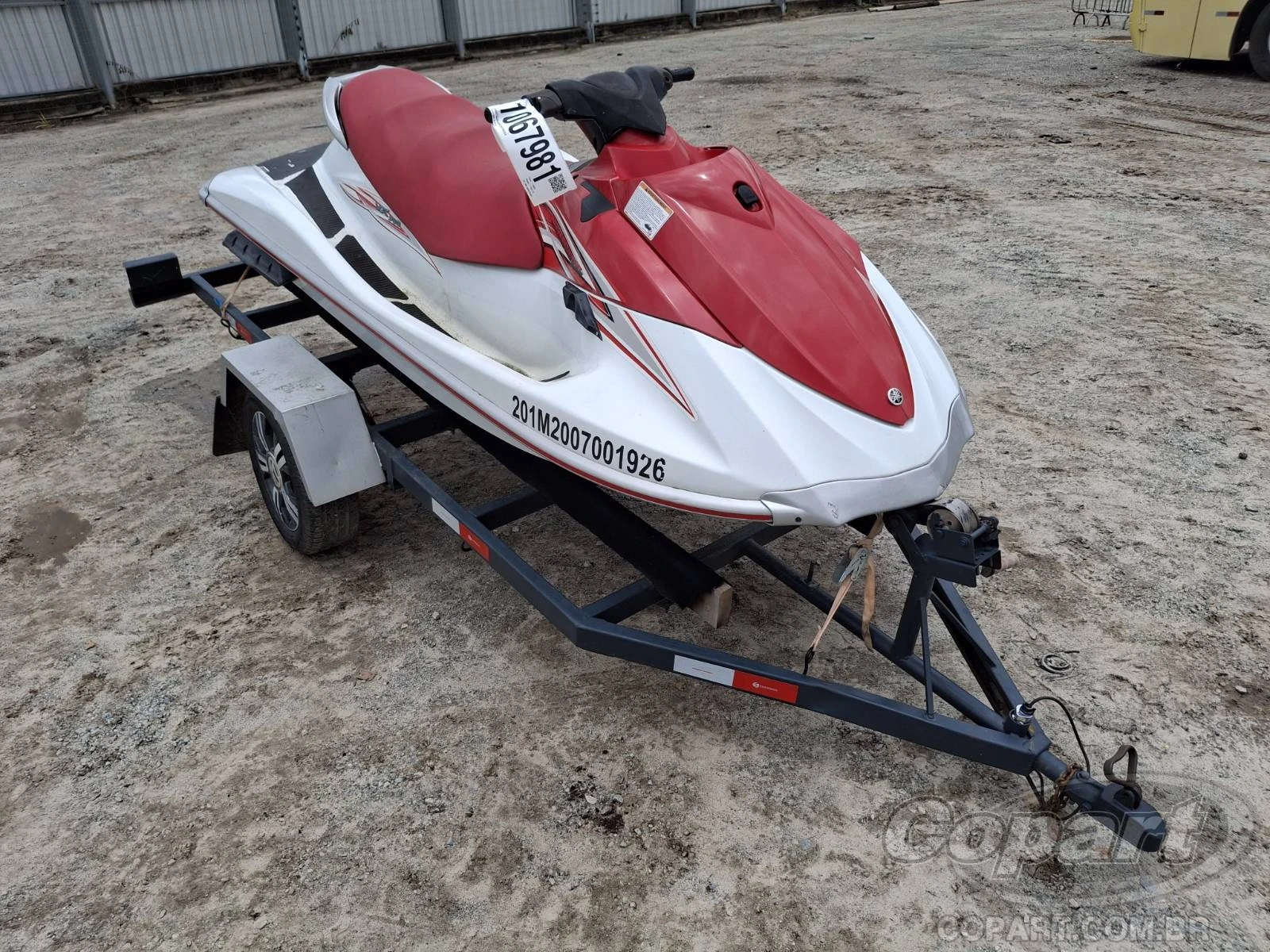 Veículo reboque com Jet Ski vermelho acoplado, trailer em pátio de leilão
